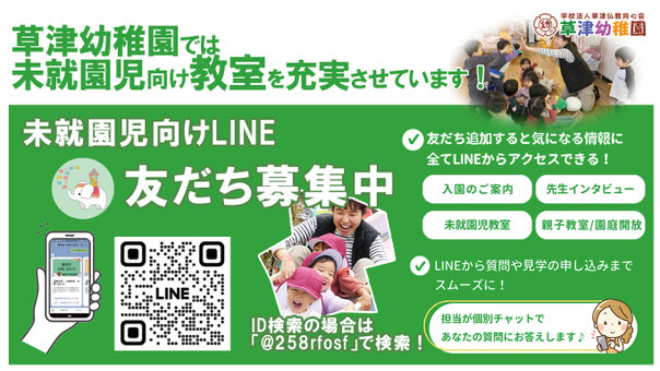 草津幼稚園の未就園児向け公式LINEです。未就園児向けプログラムの詳細情報開示をはじめ、入園説明会案内やそれらへの参加申込にも対応します。